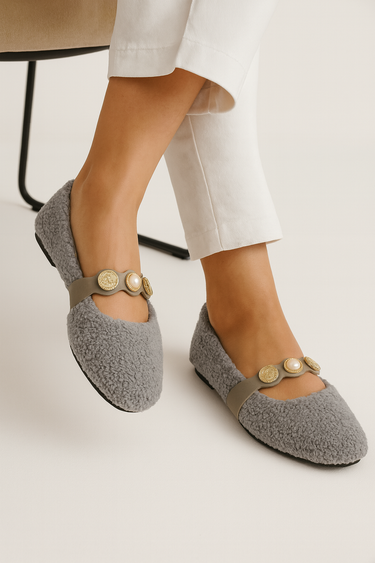 • Göz alıcı para tokasıyla dikkat çeken gri babet, minimal tarzın en şık hali.