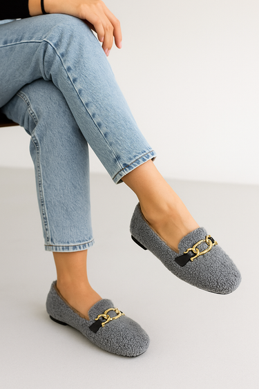- Konforlu yürüyüşün en şık hali: Kadın gri zincirli babet ile tarzınızı sade ama etkileyici kılın.