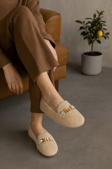 - Kadın ev ayakkabısı kategorisinin öne çıkan modeli: taşlı bej peluş babet.