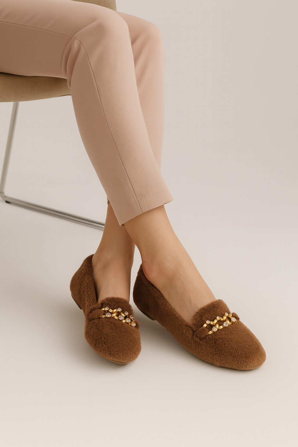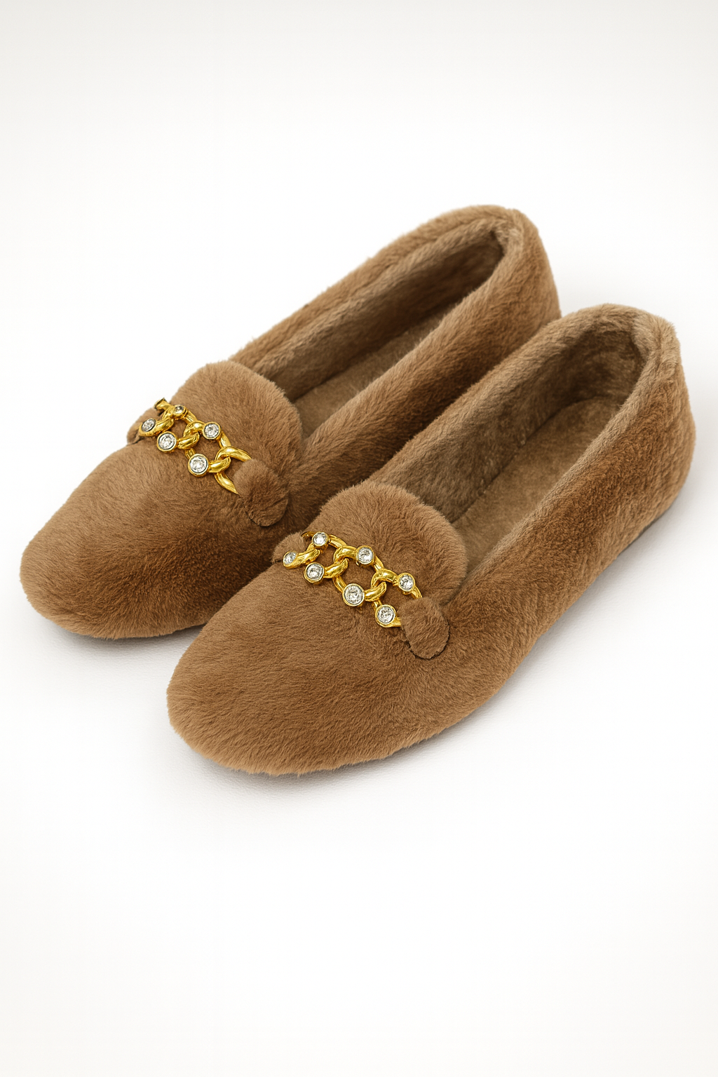 Beyond Kadın Kahverengi Taş Aksesuarlı Zincirli Peluş Ev Babeti (BYNDVT04), evde hem sıcaklığı hem de zarafeti bir arada yaşamak isteyen kadınlar için tasarlandı. Yumuşacık peluş dokusu ayakları sıcacık sararken, zarif taş ve zincir detaylarıyla ev şıklığını bir adım öteye taşır.