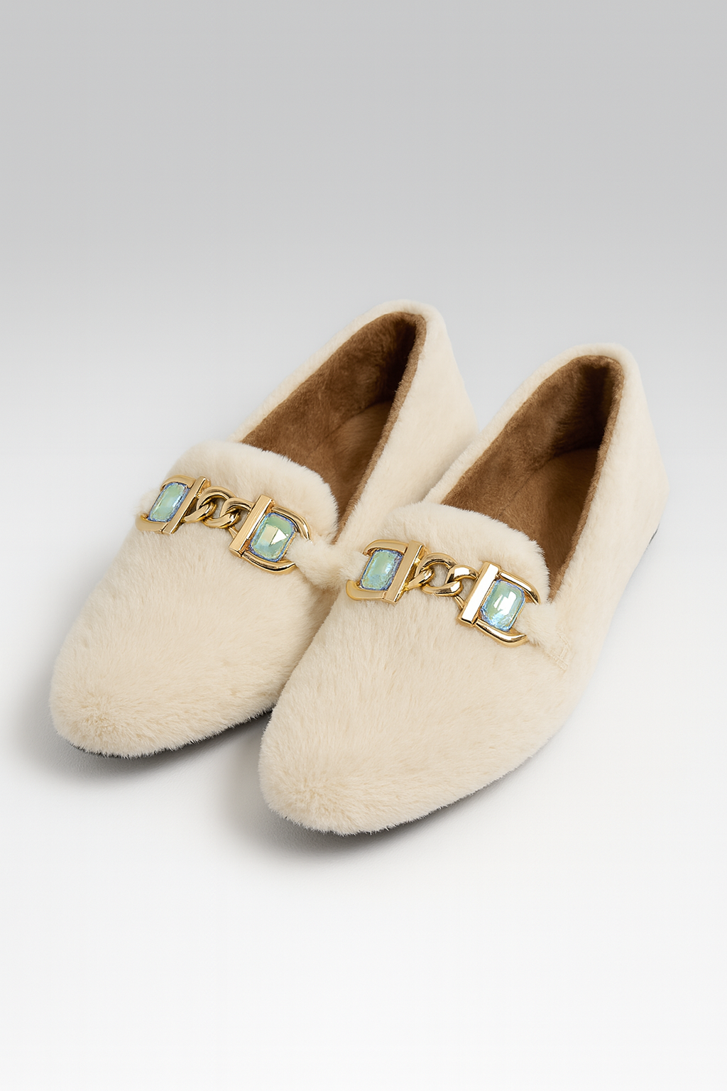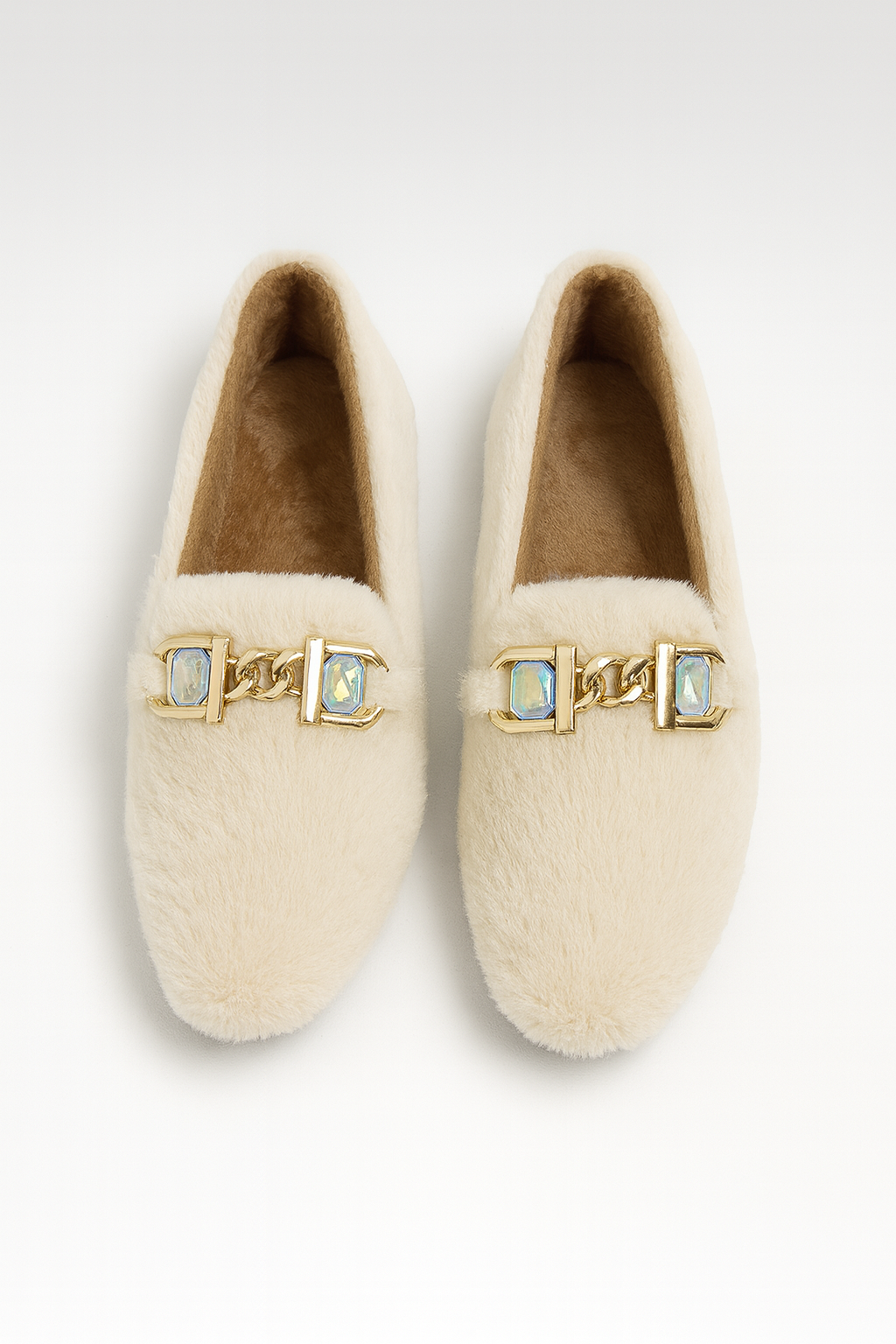 - Kadın ev ayakkabısı koleksiyonunun en şık parçası: krem taşlı ev babeti.