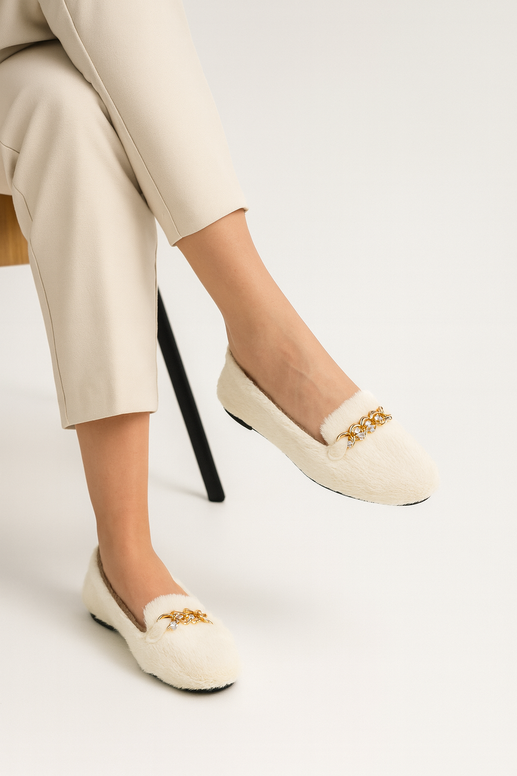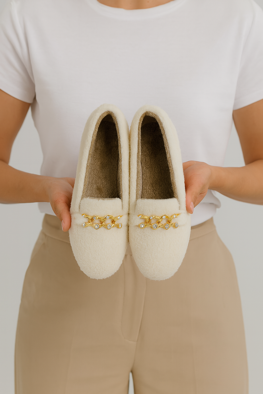 Beyond Kadın Krem Taş Aksesuarlı Zincirli Peluş Ev Babeti (BYNDVT04), ev konforunu şıklıkla buluşturmak isteyen kadınlar için tasarlanmıştır. Yumuşak peluş kumaşıyla ayakları sıcak tutarken, zarif taş ve zincir detaylarıyla sofistike bir görünüm kazandırır. Krem tonunun zarafetiyle her stile kolayca uyum sağlar.