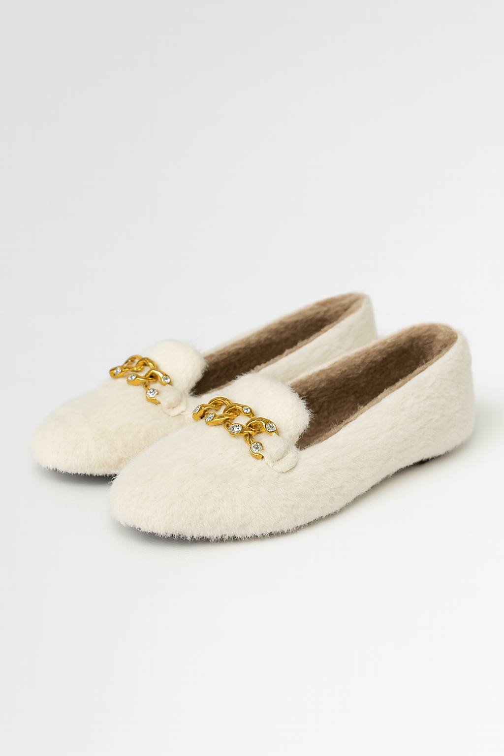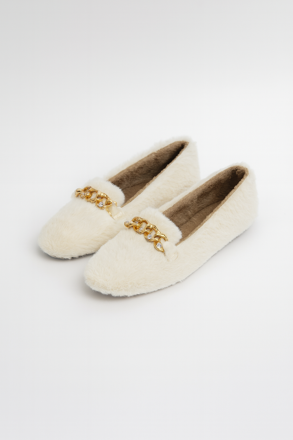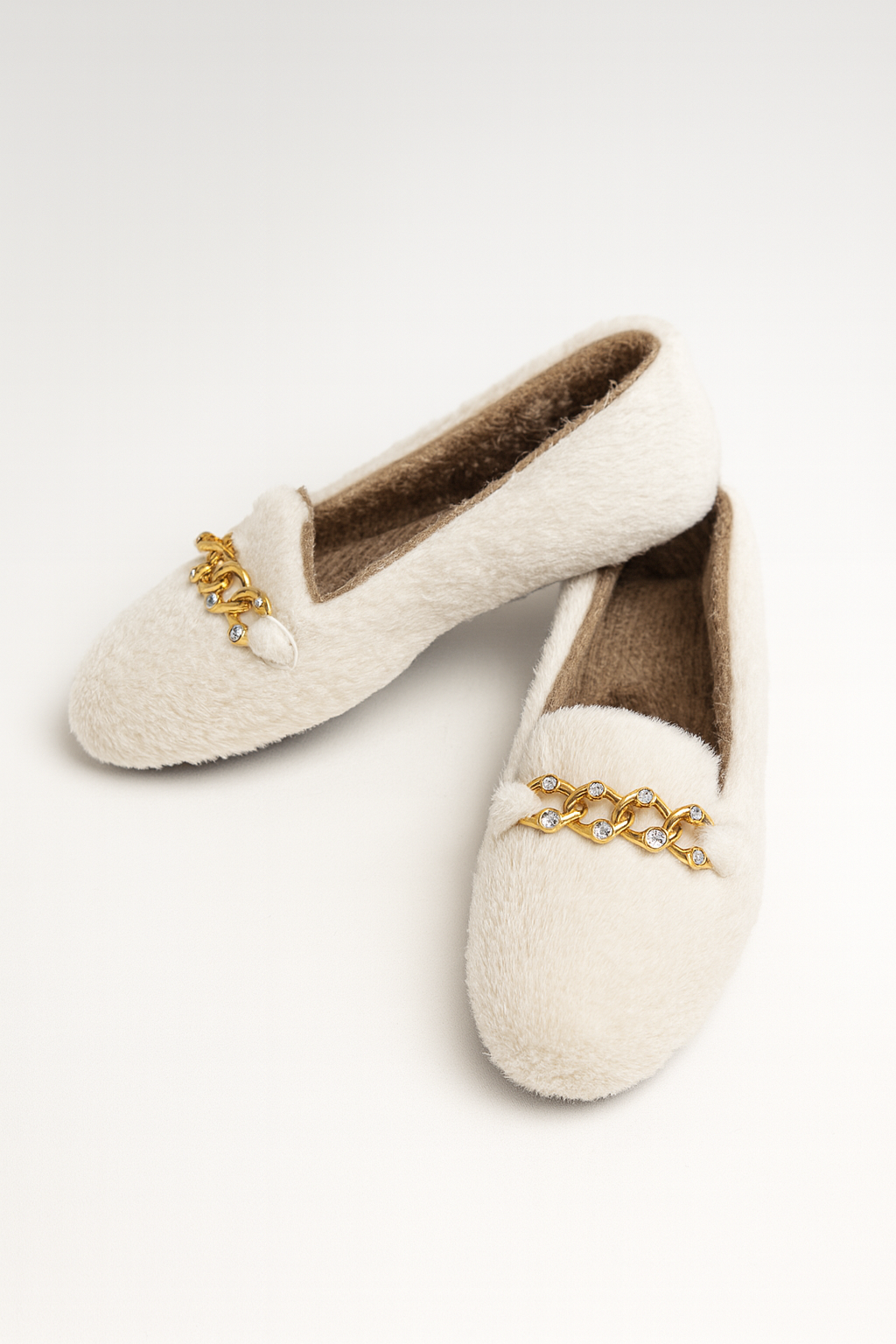- Sıcacık peluş dokusu, göz alıcı taş ve zincir detayıyla ev kombinlerinize zarif bir dokunuş katar.