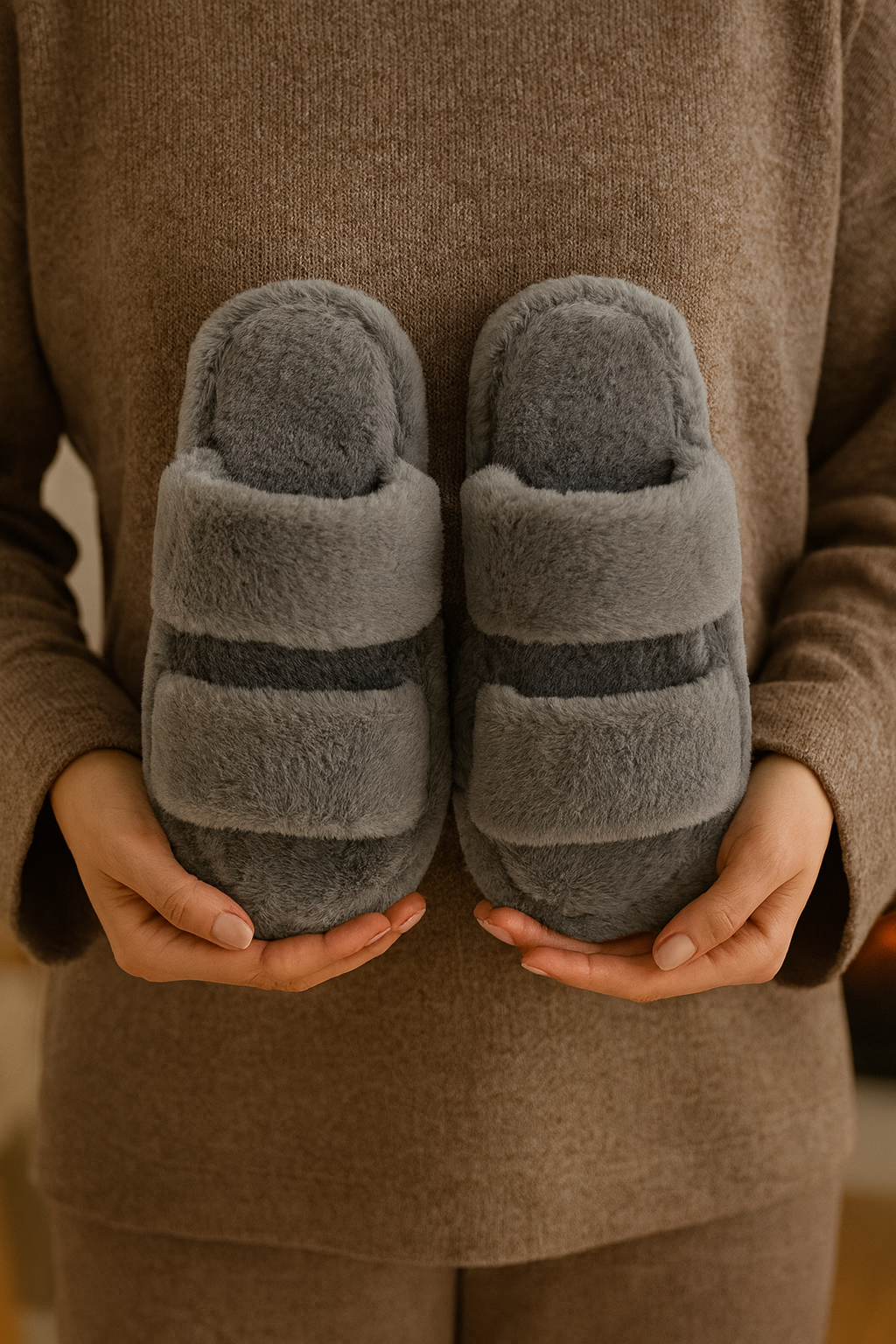 Modern ve sofistike tasarımıyla öne çıkan bu özel model, füme rengin asil tonlarını yumuşacık tüylü dokusuyla buluşturuyor. Çift bantlı yapısı ayaklara dengeli bir kavrayış sağlarken, peluş dokusu kış aylarında sıcacık bir konfor sunar. Füme rengin derin ve zarif görünümü sayesinde ev stilinize modern bir hava katarken, minimalist tasarımıyla her tarza uyum sağlar.