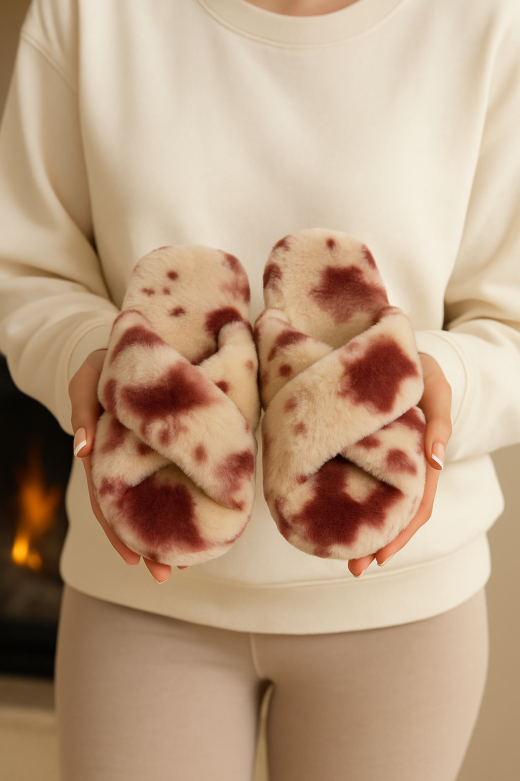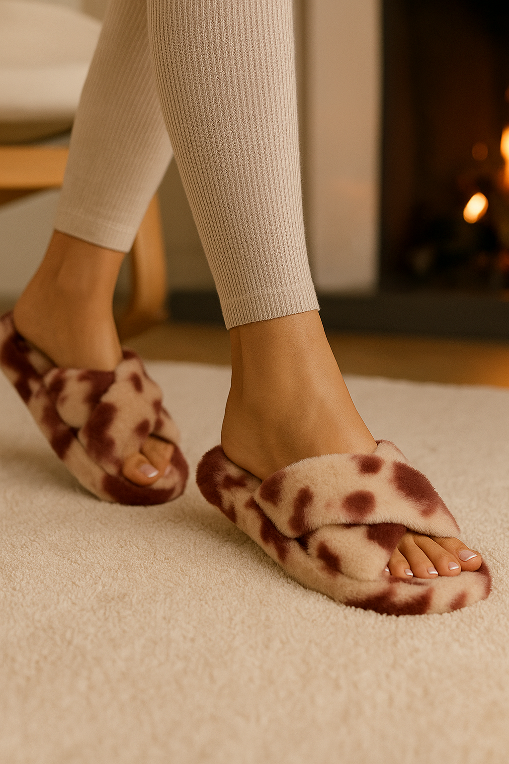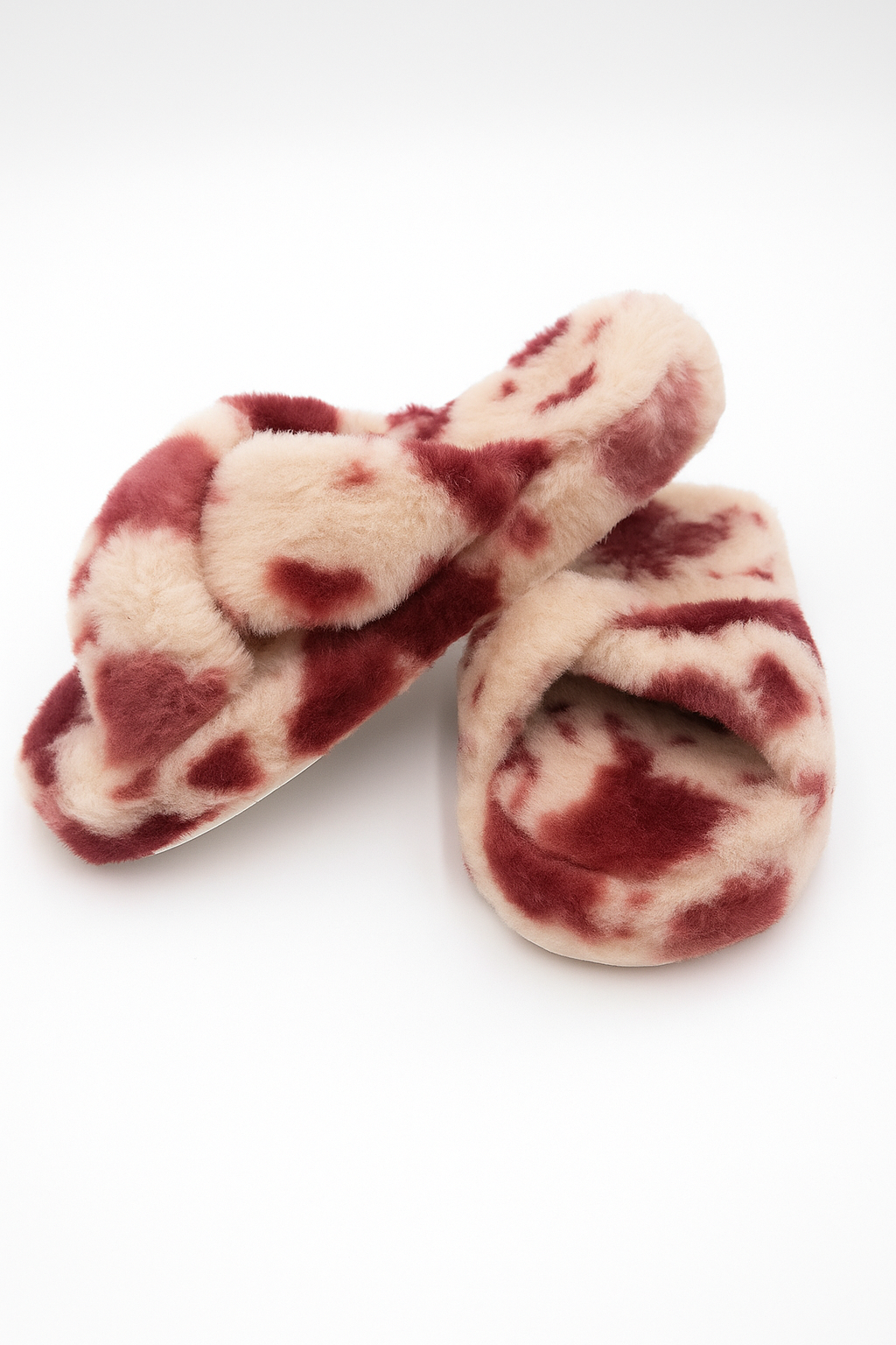 Beyond Kadın Dalmaçya Desenli Bordo Beyaz Çapraz Bantlı Tüylü Ev Terliği BYNDCAP01