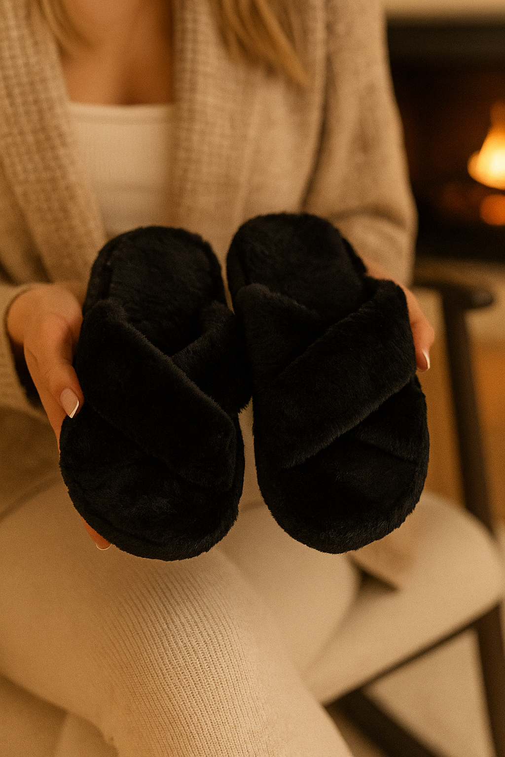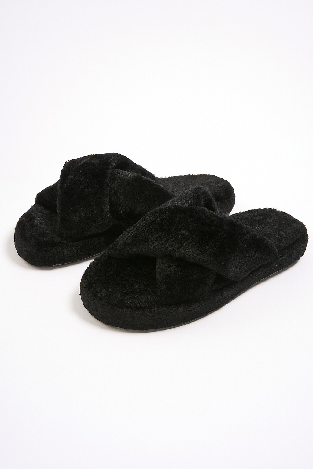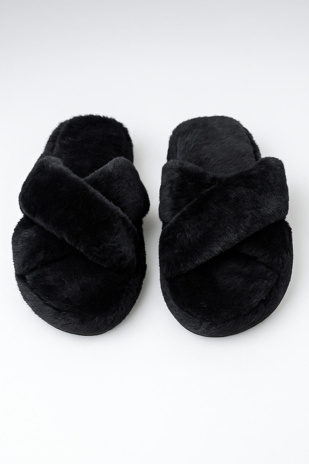 - Kış günlerinin vazgeçilmezi: sıcak tutan ve zarif görünen peluş siyah terlik.