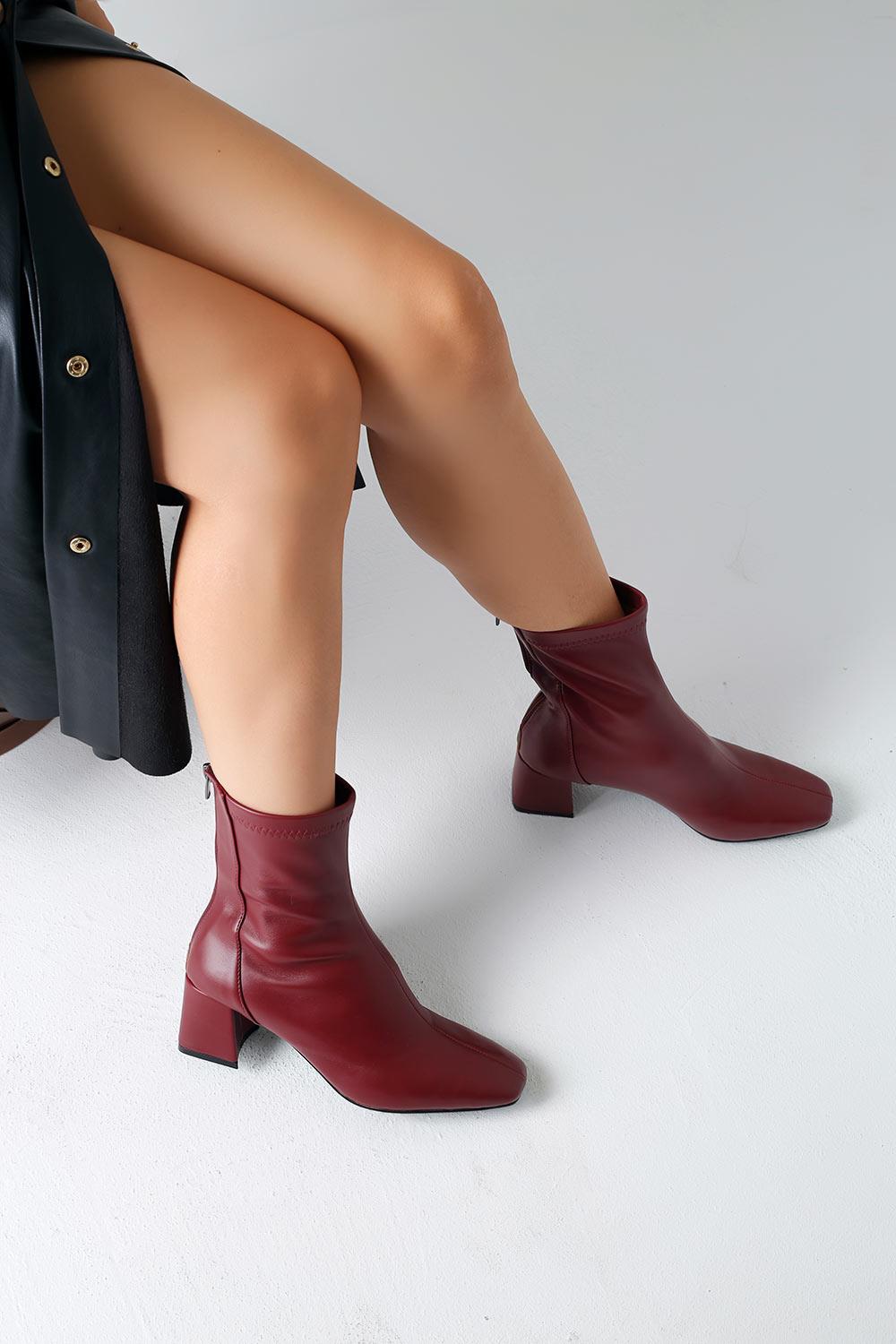 - Şıklık ve Konforu Bir Arada: Bordo Pekin Streç Küt Kalıp Deri Bot, 5 cm topuk yüksekliği ve çorap bot tasarımıyla kış aylarında stilinizi yükseltir.