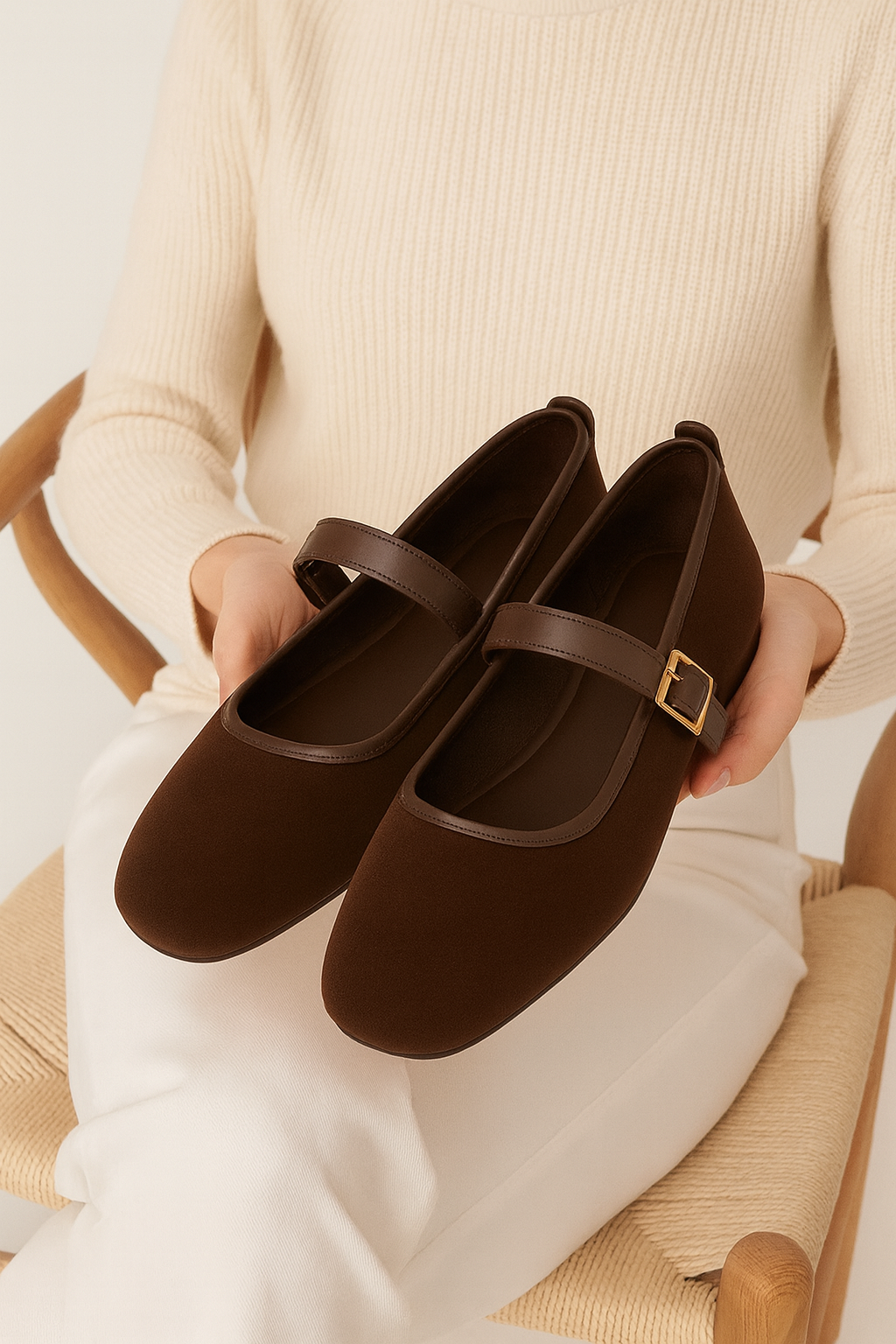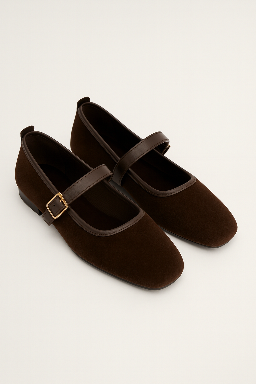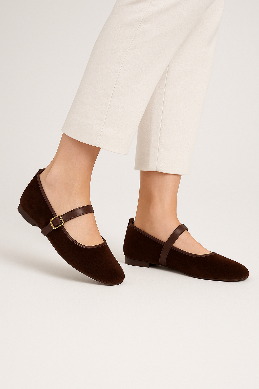 - Kahverenginin asil tonuyla buluşan kadife zarafeti: Beyond Tokalı Kadife Babet ile adımlarınızı şıklaştırın.