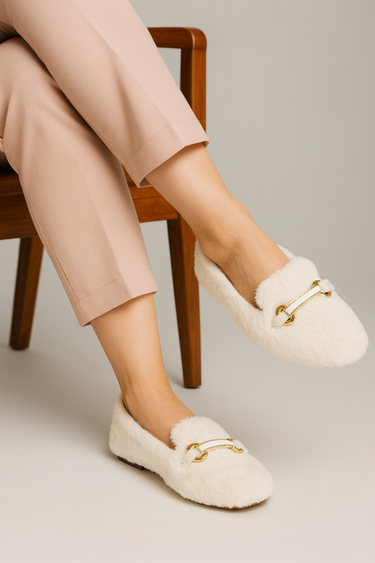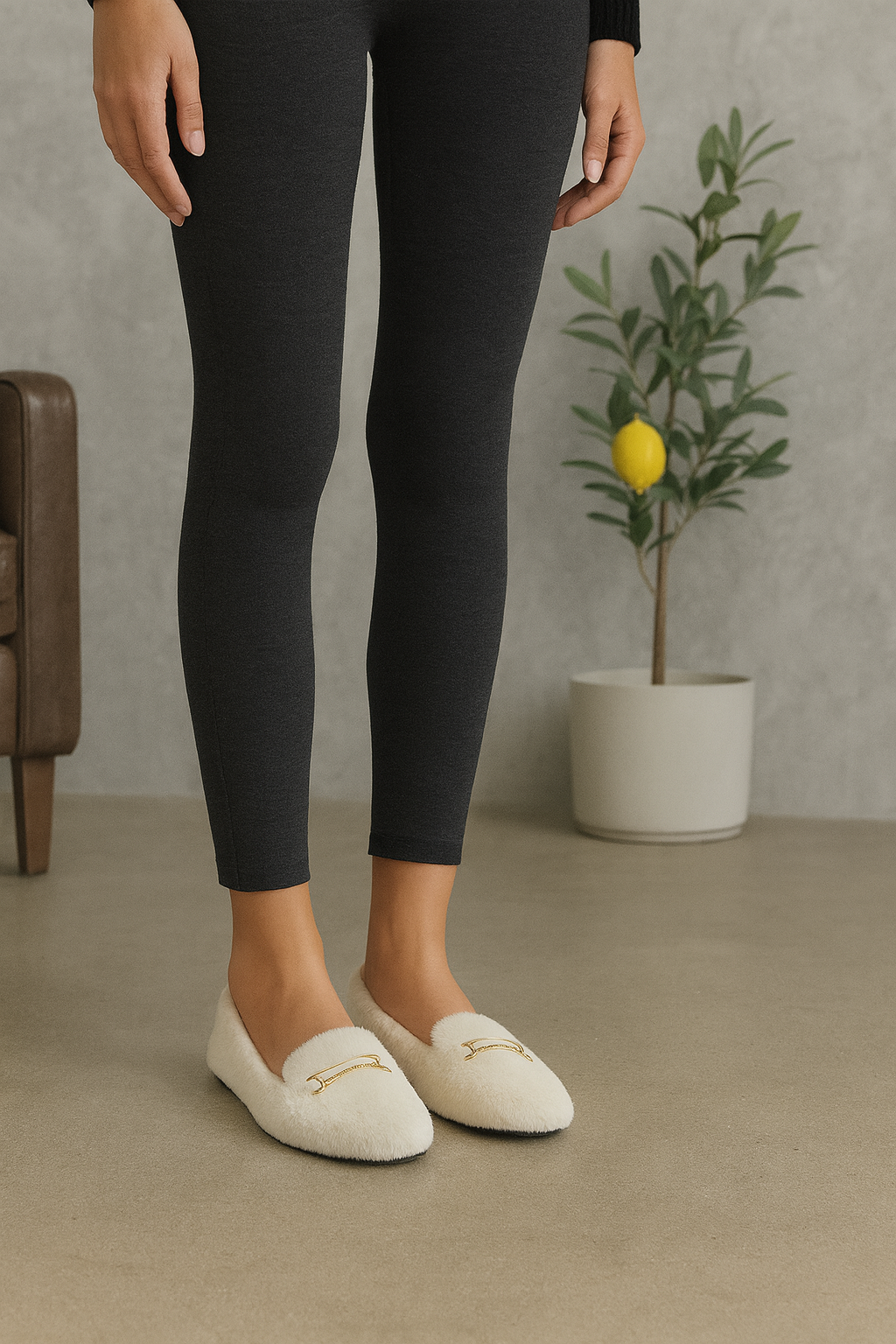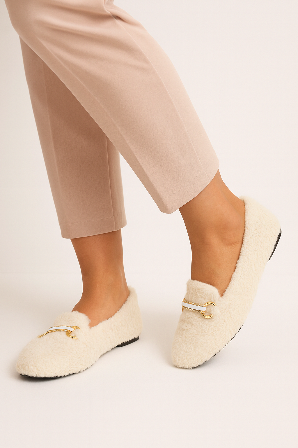 - Günlük konforu ve şıklığı bir arada sunan krem ev babeti, ev kombinlerine uyumlu.