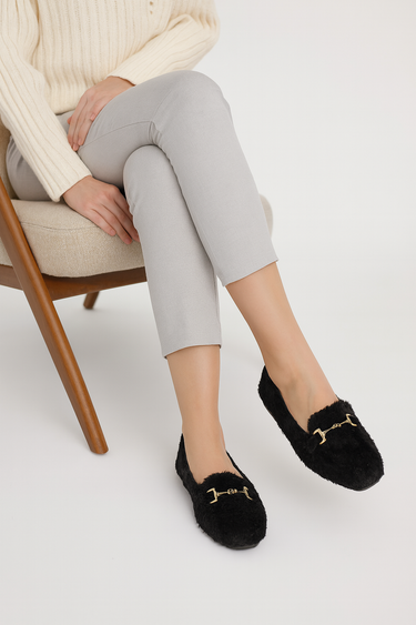 - Kadın ev terliği arayışınıza şık bir çözüm: Beyond Siyah Tokalı Peluş Babet.
