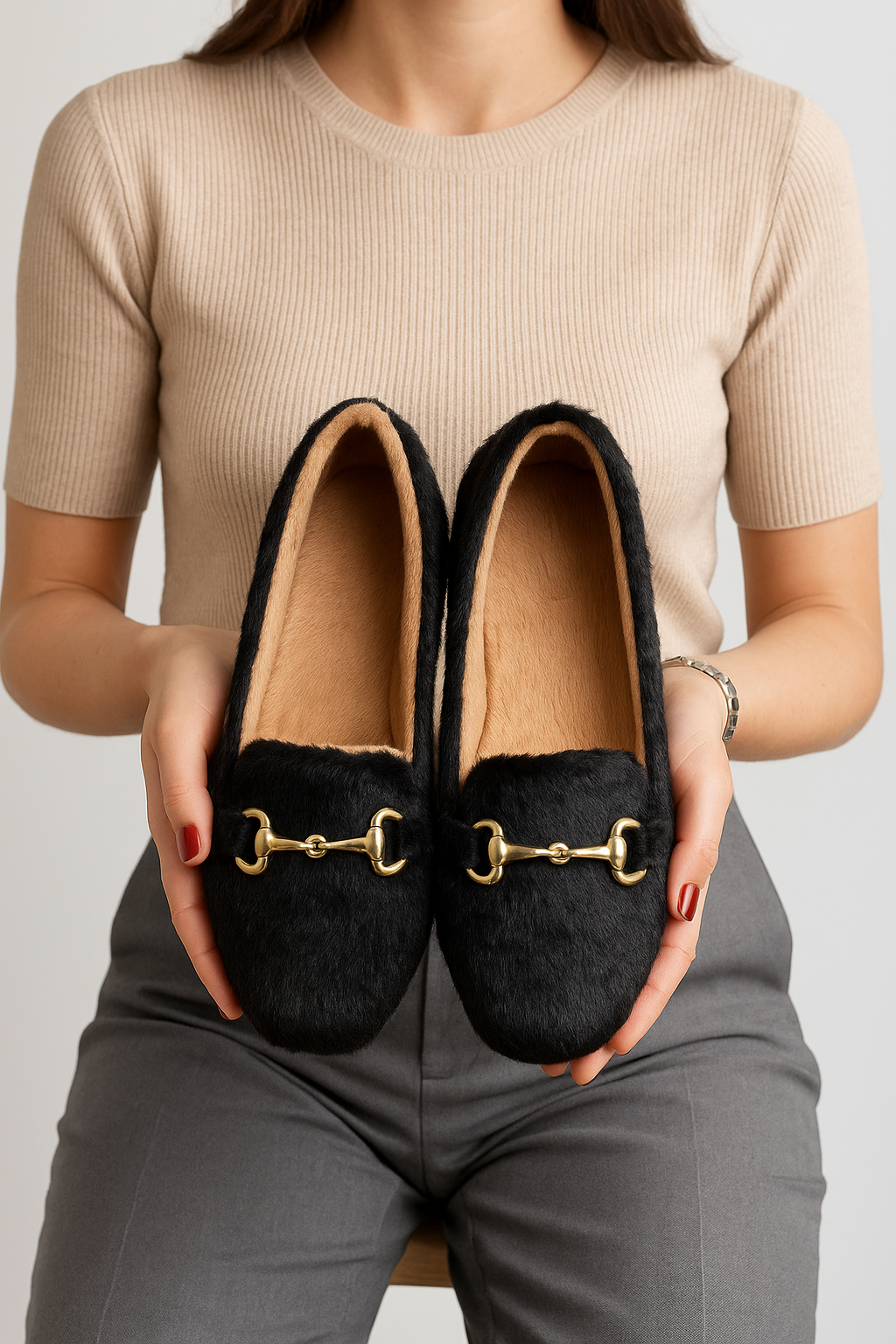 - Siyah rengin zarif şıklığı, peluşun yumuşaklığıyla birleşti: Beyond Kadın Tokalı Ev Babeti.