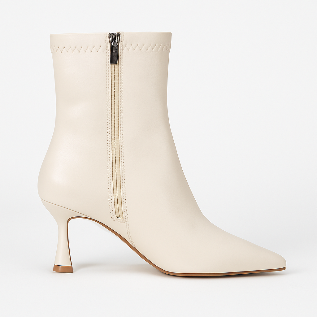 • İnce topuğu ile zarafet, peluş astarı ile konfor: Krem kısa topuklu kadın bot sizi bekliyor.